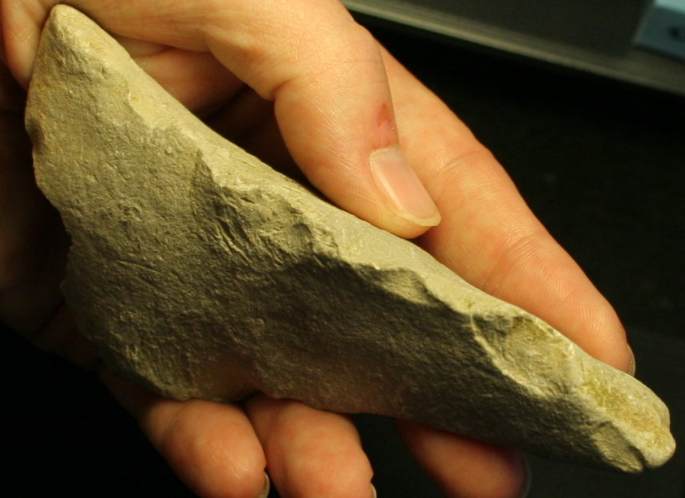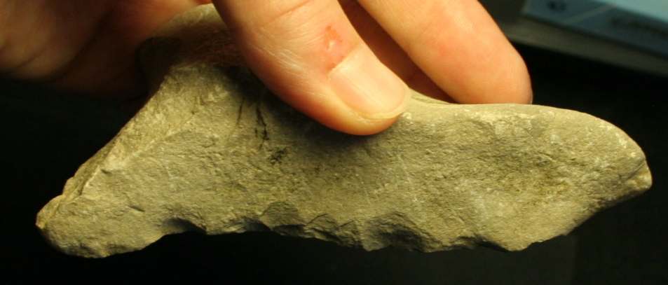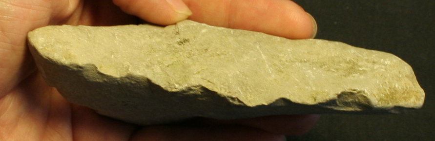 J'ai trouvé ce qui semble être un outil en forme de pointe en calcaire qui semble présenter des retouches en contexte paleo. A priori ce serait un racloir...