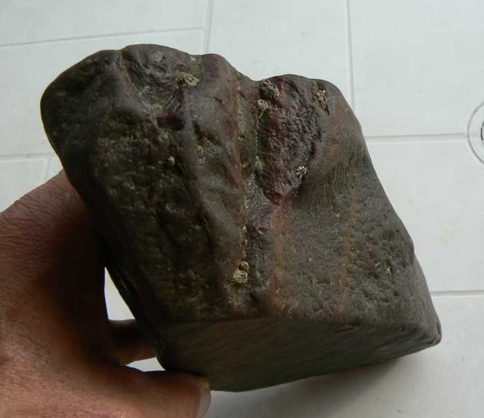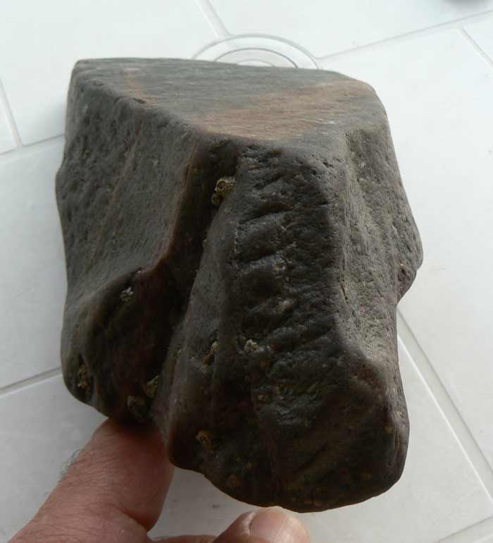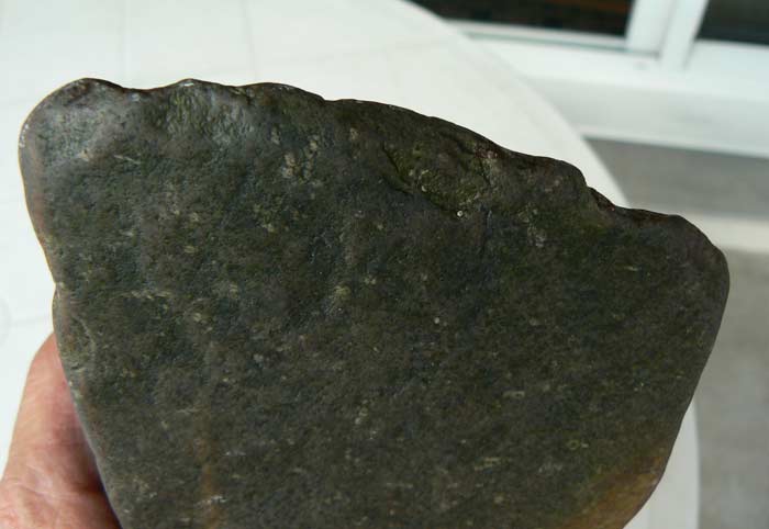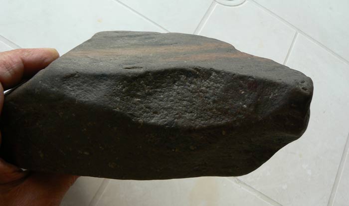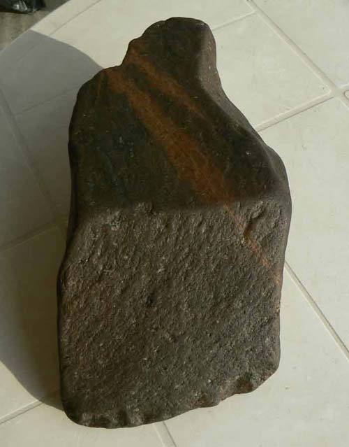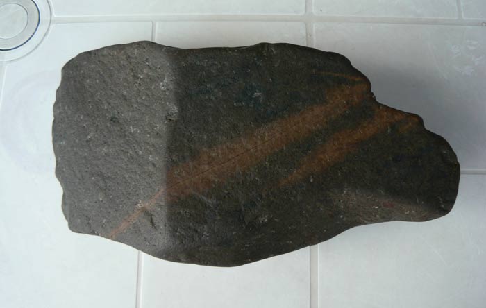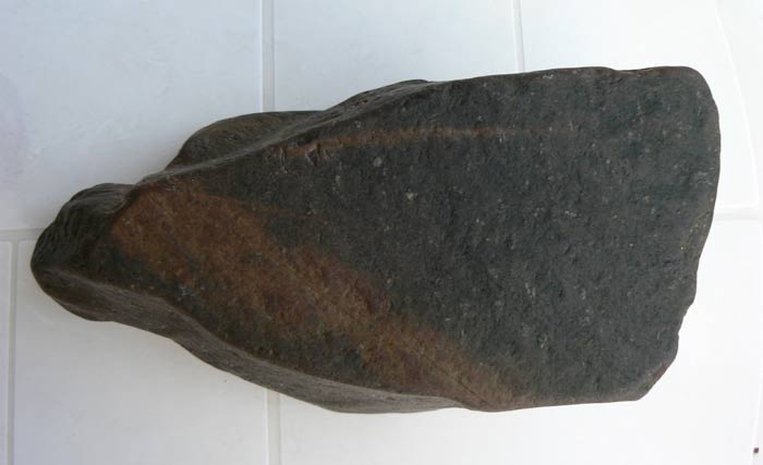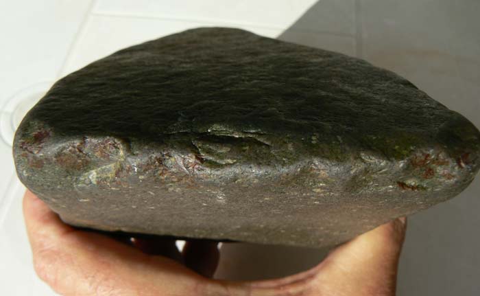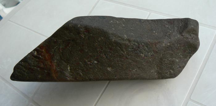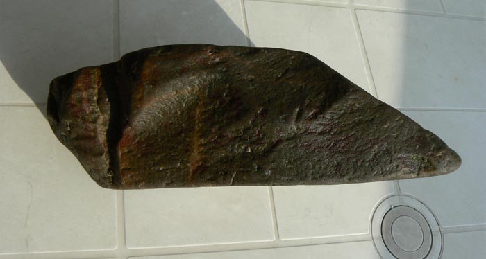 Content de vous retrouver après deux mois d'absence, parti faire un décor de bar au bord de la côte, mais j'ai quand même pris le temps de faire quelques côtes les yeux au plancher,essentiellement des plages de galets et de rochers. Je vous poste donc ma toute première trouvaille qui me semble être un chopper en dolérite peut-être ? Il pèse 3kgs100 et mesure 22 cms de long par 7 cms d'épaisseur. Merci d'avance pour vos commentaires.