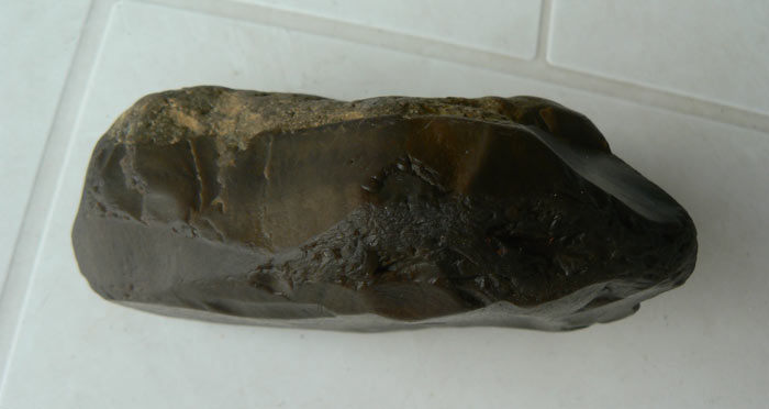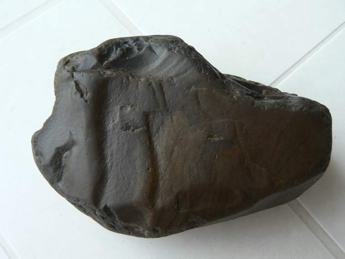 Toujours dans la série des cailloux du bord de mer, trouvé ce silex qui me semble être un chopping-tool avec ses trois enlèvement caractéristiques, il ressemble beaucoup à ceux que j'ai pu voir sur le net.