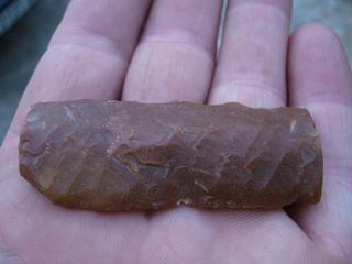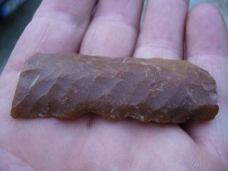 Comme Néodom, c'est une belle lame qui possède des retouches parallèles qui se font généralement à partir d'une pointe en cuivre. C'est pour cela que la datation chalco est plus que probable. Concernant la réutilisation il y a fort à parier (d'après les deux coches centrées) que l'on ait affaire à une réutilisation tardive comme pierre à briquet.
