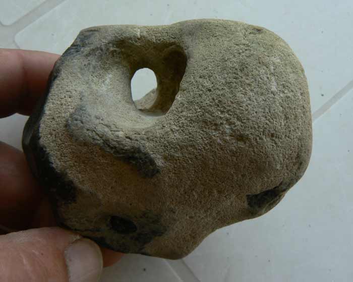 d'autant plus qu'ils n'en trouvent qu'un seul dans un abris... si encore il y en avait plusieurs au même endroit on pourrait supposé qu'il y avait un filet a l'endroit de la découverte... mais la... il y a qq photo sur le site de la joconde, ceux qui sont percées intentionnellement d'un trou, pourquoi pas, les autres... c'est beaucoup plus subjectif (trop pour moi... je veux pas être plus royaliste que le roi, mais je trouve que par moment, il se contente de peu de preuves pour arriver à leurs conclusions)