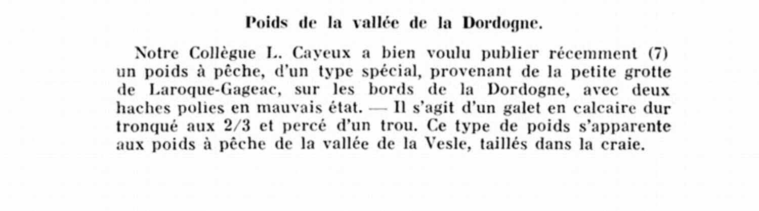 Effectivement on ne peut qu'émettre que des hypotèses pour le moment, je te joins cette gravure trouvé dans une revue ancienne d'archéologie qui prouve au moins que les poids de pêche on existés, soit en lestage de filet ou de ligne de fond (dixit l'auteur ) ils possédaient des encoches des deux côtés et parfois sur quatre côtés, je te joins aussi un extrait du même auteur dans lequel il parle d'un galet en calcaire perçé d'un trou et servant aussi de poids.Cordialement.