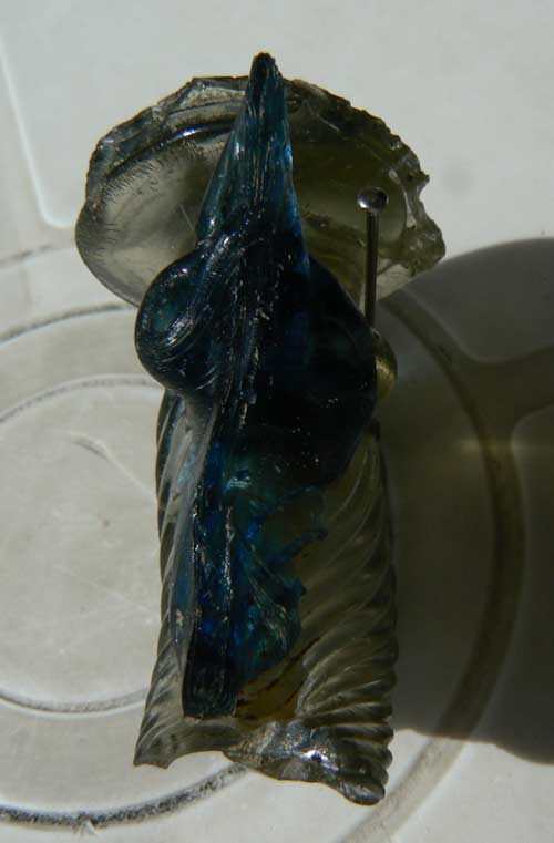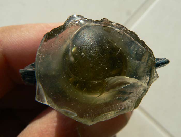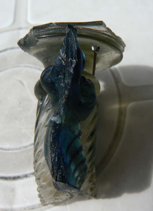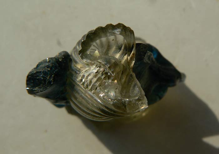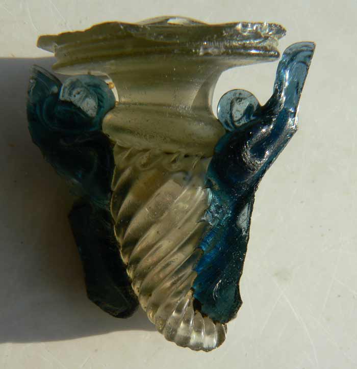 Pour changer des cailloux, un peu de verroterie, trouvé ce fragment en bord de rivière, a-t-il appartenu à un verre ou petit vase ( 4cms de hauteur ) ? l'intérieur du tube torsadé est creux et le feu certainement l'a tordu. Pensez-vous qu'i soit ancien ? Merci pour vos avis.