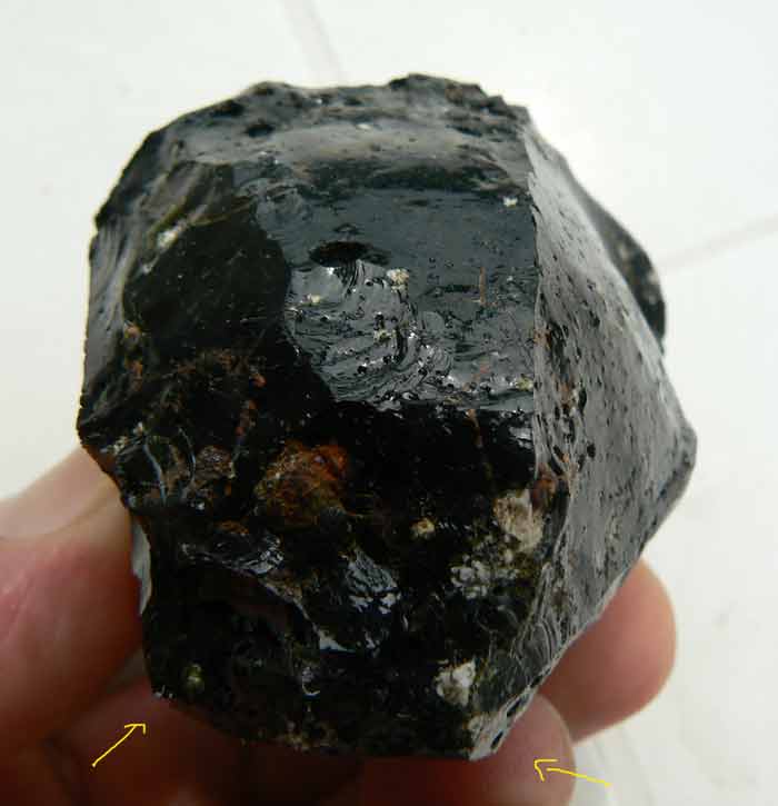 Les taches blanches sont des petits grains de quartz blanc, on y voit aussi des trace d'oxyde de fer, j'ai mis des petites flèches jaunes pour délimiter ce que j'appelle la ' pointe ', l'endroit vers ou convergent les enlèvements afin de s'y retrouver dans les photos. Qu'en pensez-vous ? Merci pour vos avis.