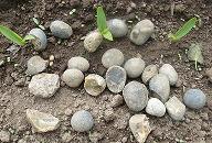 oui, vraiment bizarre et curieux de trouver dans une même parcelle une telle quantité de petits galets lisses de silex de forme plutôt ronde ou ovalisée, de dimension approxivement constante de diamètre 3 à 4 cm, certaines 'billes' sont entières, d'autre sont éclatées plus ou moins.