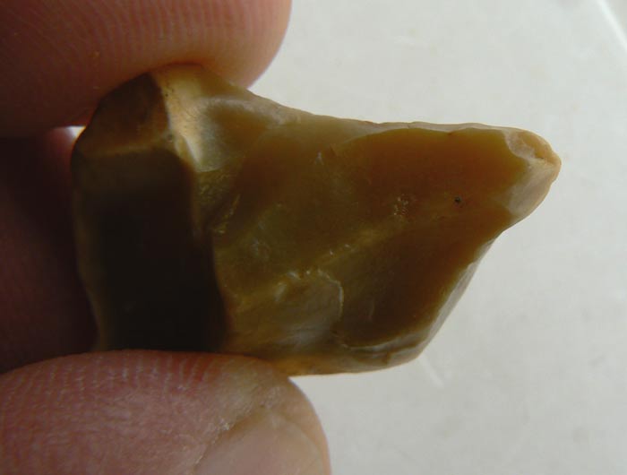 En R2: la petite lamelle de silex accolée à la paroi de la pointe. Si je veux me servir de ce truc comme perçoir, je me débarrasse de ce bout de silex gênant.