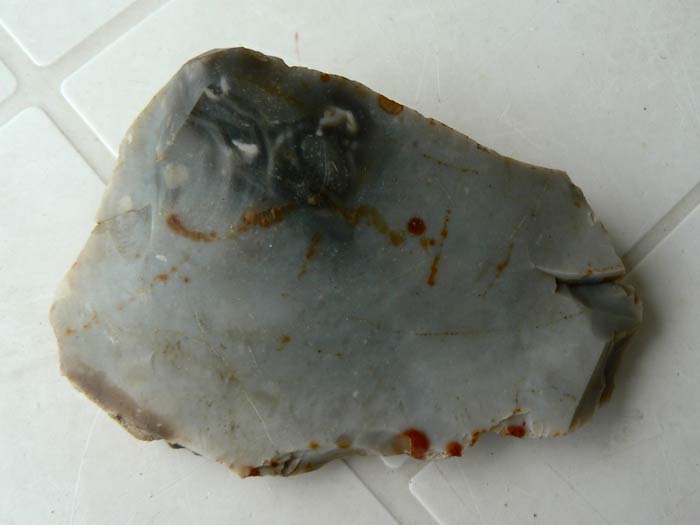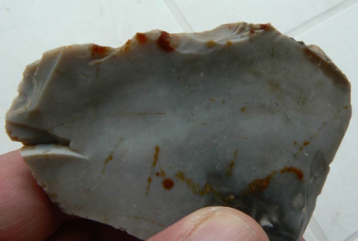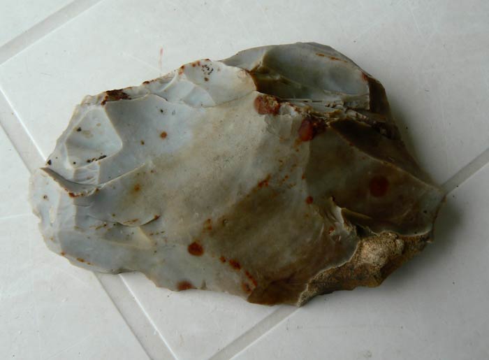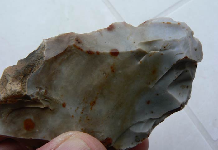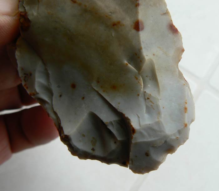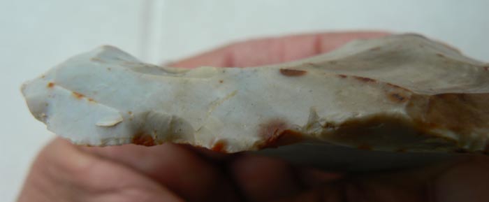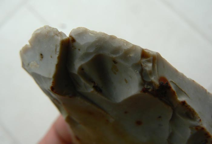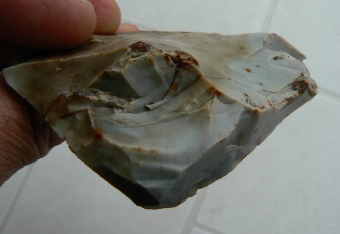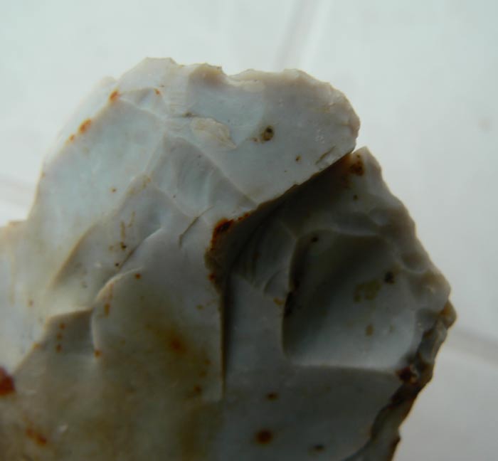 Je ne remet pas en cause le fait que ce silex soit anthropique du fait du bulbe de percussion, mais bon l'emplacement des retouches ne me paraît pas logique car le silex est au bord de la rupture et il aurait été plus simple d'aménager une partie plus saine du même silex, que d'insister a vouloir utiliser cette partie. (mais bon ils étaient peut-être têtus à l'époque... un peu comme moi )