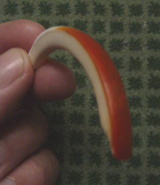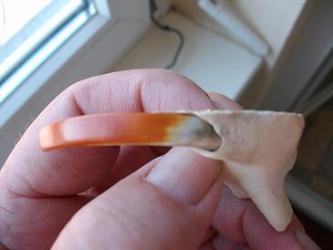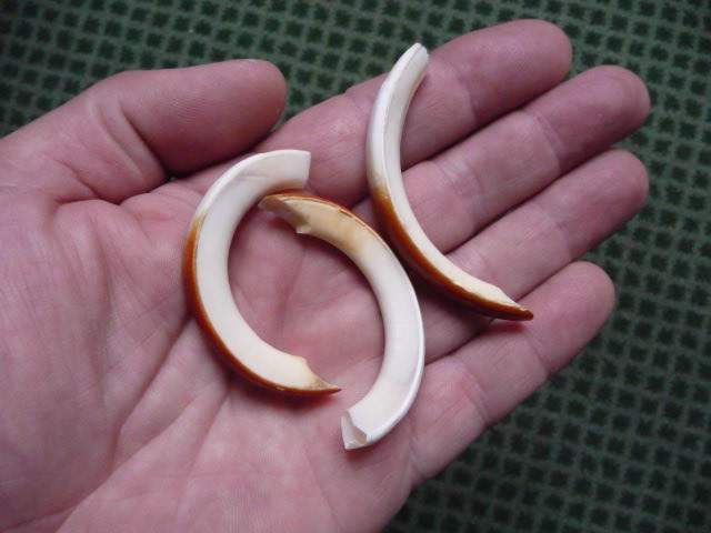voici quelques insicives prélevées par moi sur un squellette de ragondin, elles sont très longues par rapport à celles du castor, la face avant, celle qui pourrait etre visible des prédateurs quand l'animal est dans l'eau boueuse, est colorée en orange, la nature est prévoyante et bien faite quand meme...