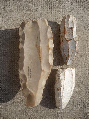 2 nuclei a lames de 13 cm. en silex blanc du Nord de la France (l'Aisne bien sur !), proche de la frontiere Belge et un nucleus GRIS du Pressigny de 27 cm. dont la couleur peut surprendre.