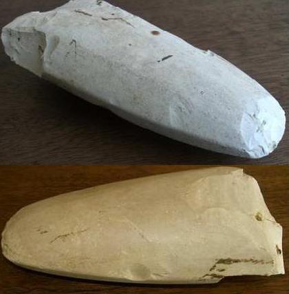 pour la matière, évidemment c'est du silex, mais je voudrais savoir si la couleur exacte est celle de la photo inférieure; si c'est le cas il pourrait s'agir de silex tertiaire. (jolie patine)