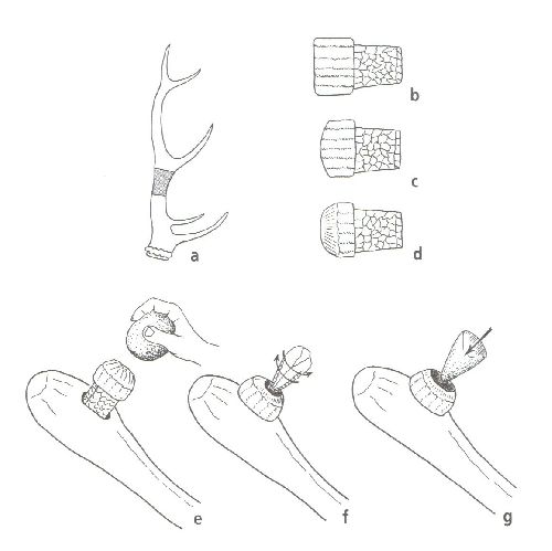 On pense que les haches de petites tailles (8 cm) étaient emmanchées dans des bois de cerfs, alors que celles de grandes tailles (>15 cm) sont directement fichées dans un manche en bois d’environ 80 cm.