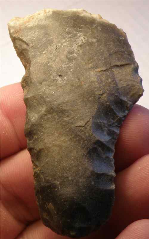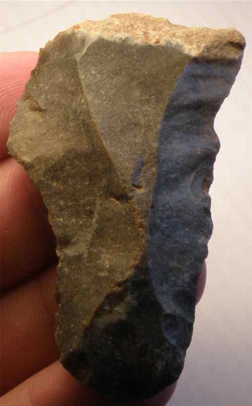 d'une longueur de 6,5 cm les deux tanchants sont retouchés et s'évasent vers l'extrémité qui conserve du cortex