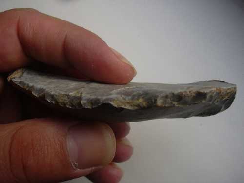 voici ce que pense etre une lame , mais sur une face les retouches sont alternées ( sur 1ere moitiée en haut et sur l autre en bas ) et sur l autre tranchant elles sont normales .