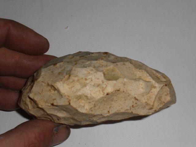 Mais ... il est tout à fait possible que les deux autres petits silex soient taillés, eux ! Pour le savoir : le classique : bulbe de percussion sur l'autre face. Ce que tu peux vérifier facilement rien qu'au toucher. Et puis, tant que tu y es, fait nous donc une photos du dessous, et voire même de profil (ce qui met bien en valeur le bulbe ... si bulbe il y a, dans ce genre là , ci-dessous )