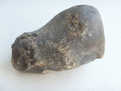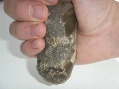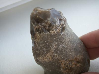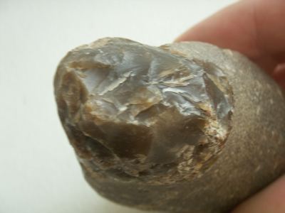 Bonjour à tous, je vous soumet ce silex bénéficiant d 'une bonne préhension, et bien abîmé au bout, peut-être un percuteur ? Merci d'avance et bonne journée.