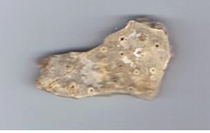 [1510] bonjour Valère et merçi de m'apporter un peu de lumière.Ce fragment mesure 5 cm de long et les petits trous 1mm de diamètre.J'en ai trouvé plusieurs petits bout dans le même champs avec une huitre.