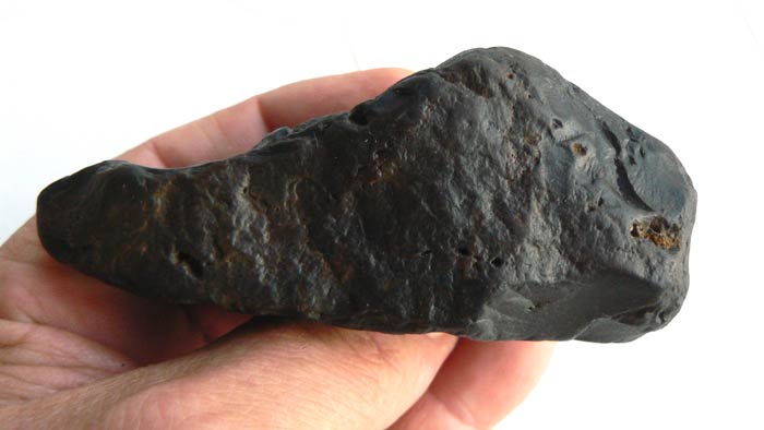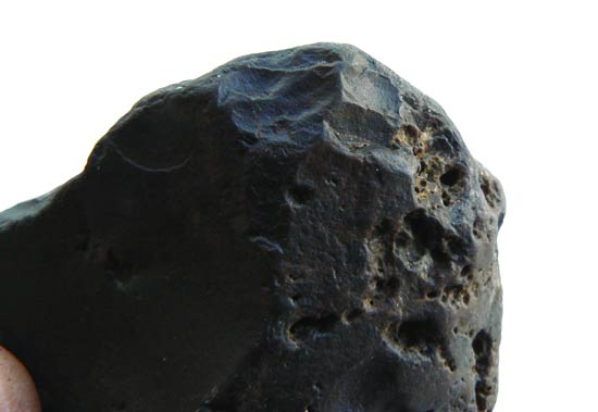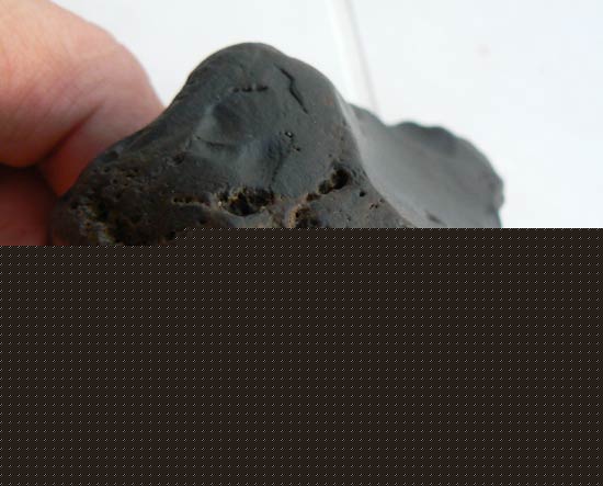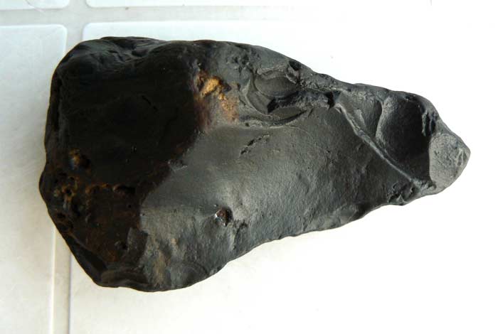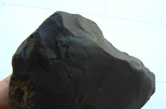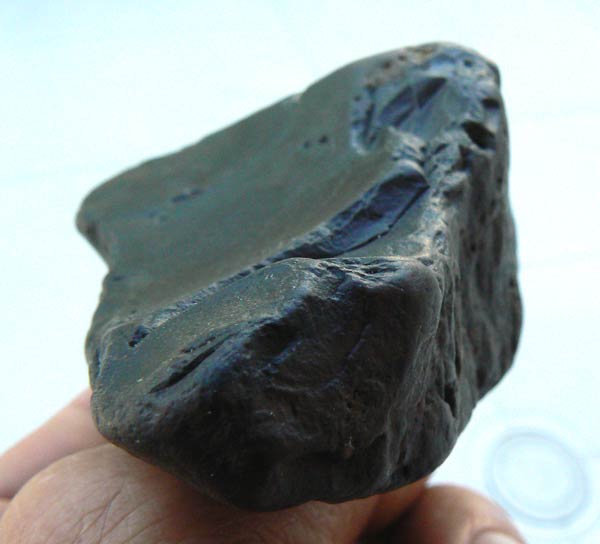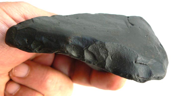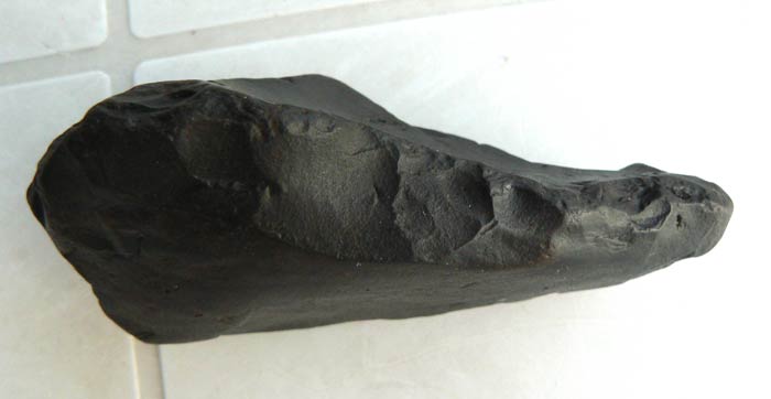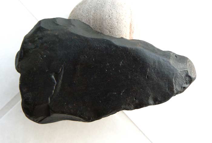 [1301] Pour moi ce pourrait etre un silex roulé sur le lit d'une riviére avec la couleur caractéristique des pierres qui séjournent qq milliers d'années dans une vase noire...ou dans le pétrole. alors le contexte? plage, rivière, plaine alluviale...ou derrick irakien?