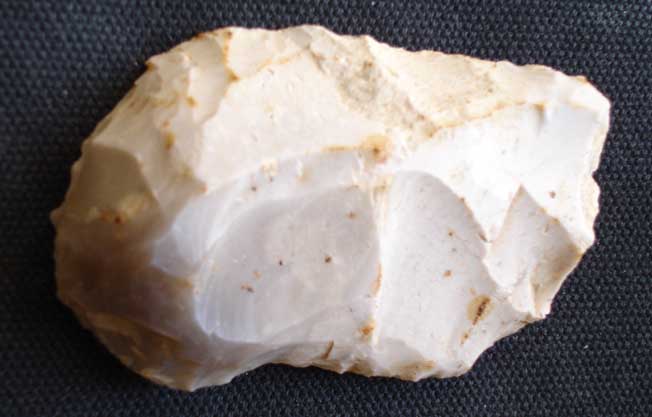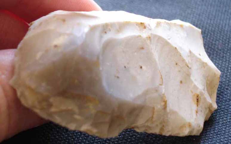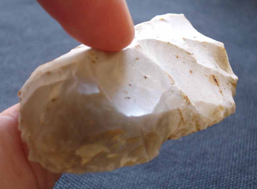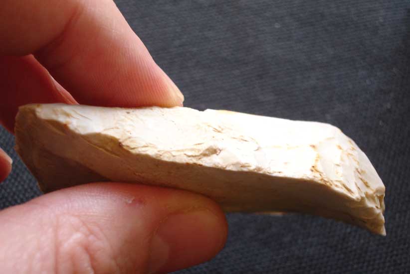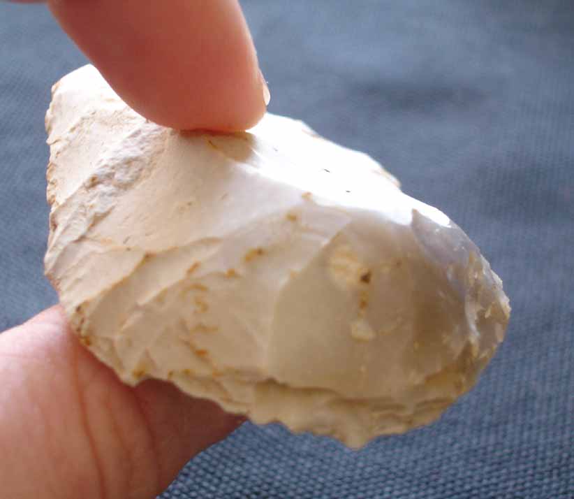 [1356] Le dessous est parfaitement lisse avec un léger bulbe de percussion (sous mon pouce sur cette photo).