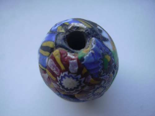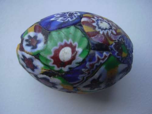 apres recherches , il pourrait sagir d une perle millefiori ( murano ) fabriquées du XVeme au XIXeme , mais d apres une fabriquation reprise depuis l antiquité .