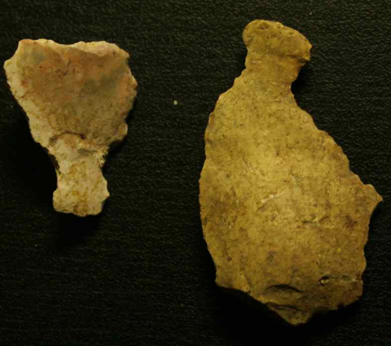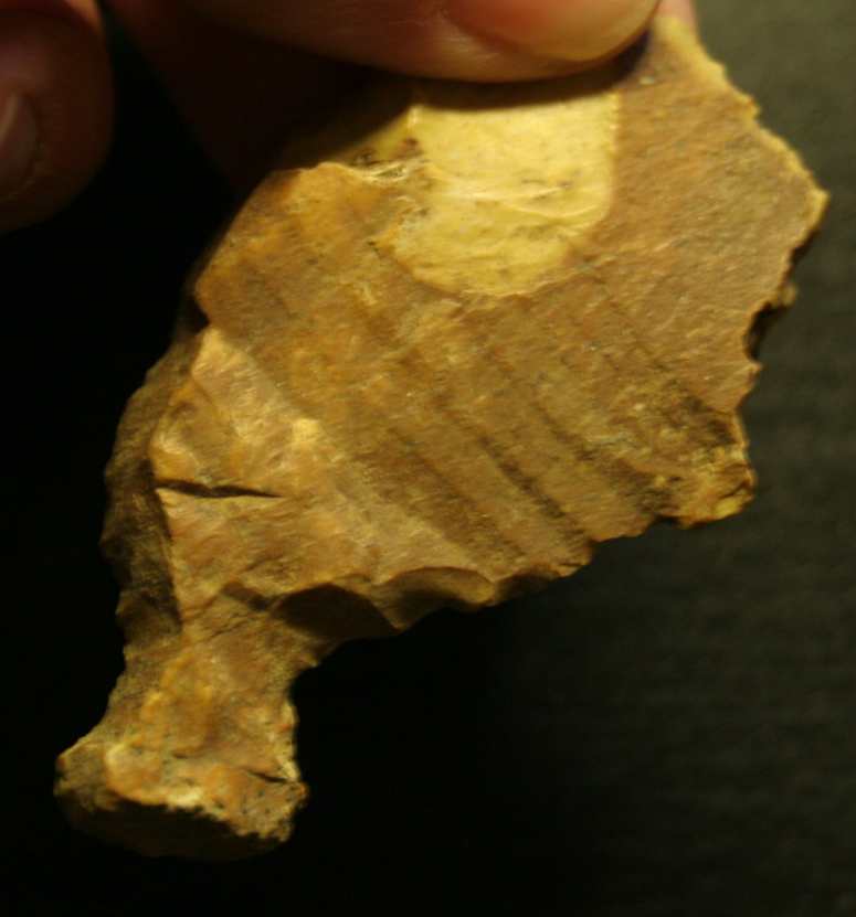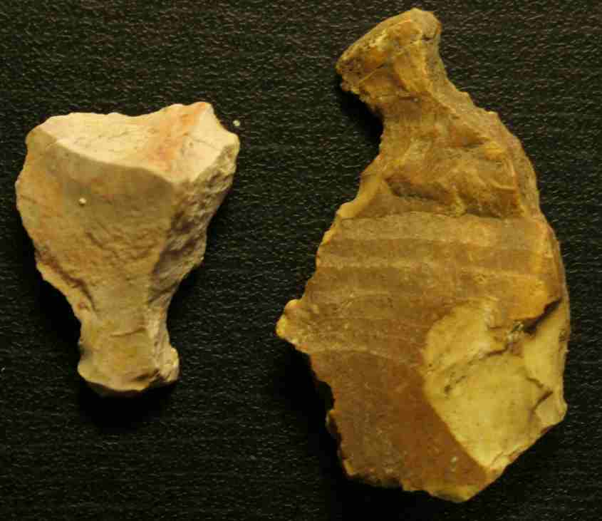 Voici deux éclats un peu bizarre trouvé en contexte paleo, qui présente le même bitoniau au bout (m'aide pas beaucoup le correcteur d'orthographe avec bitoniau...).