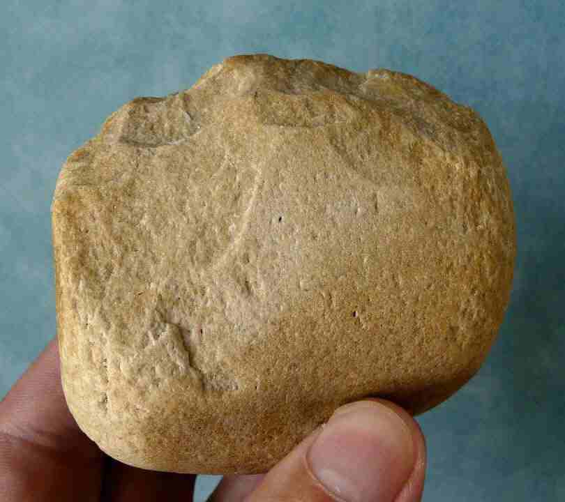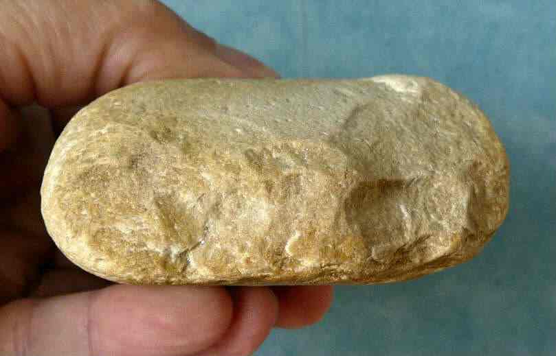 ça faisait longtemps que je n'avais pas posté de galet aménagé, pas le temps d'aller en ramasser et les conditions ne sont pas toujours au rendez-vous; en voici un trouvé il y a quelques années, un petit chopper en quartzite beige, les enlèvements sont en écaille, c'est le seul que j'ai trouvé comme ça, la main de néandertal...???