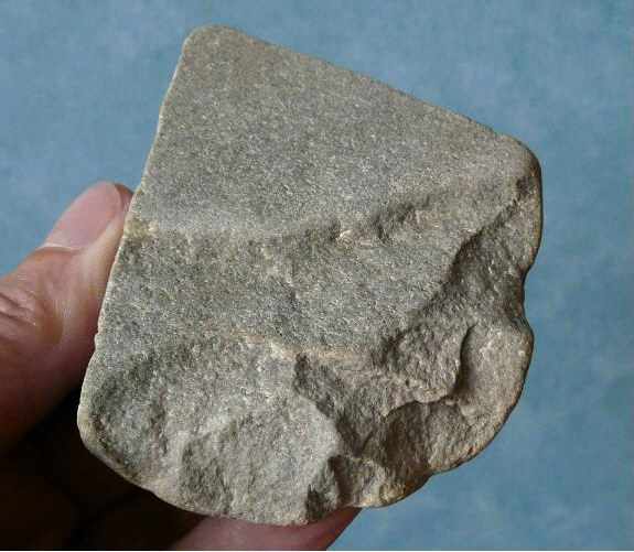 j'ai déjà trouvé un artefact semblable parmis les choppers sur galet, il est fait sur une plaquette de quartzite gris, les enlèvements sont fait au percuteur dur comme en atteste les points d'impacts visibles, paléo.inf.??? pourquoi-pas ???