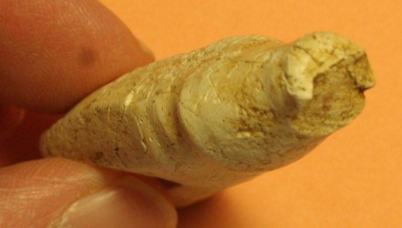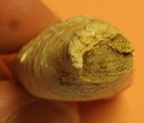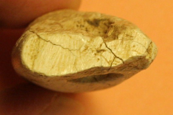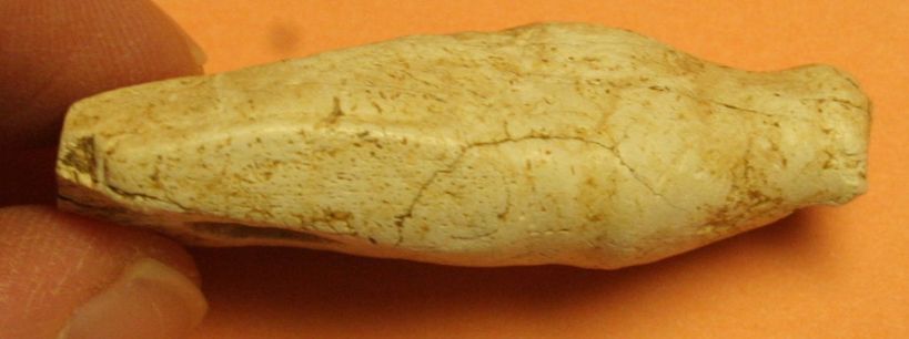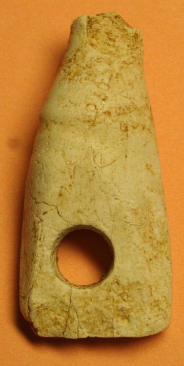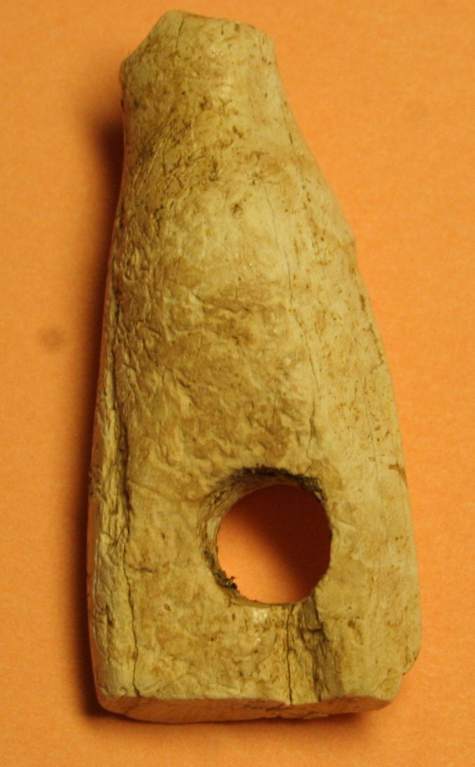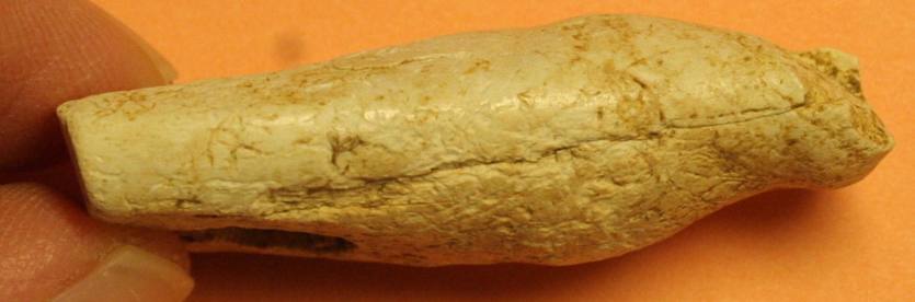 Voici qqchose que je pense etre une pendeloque en os ou en ivoire (de dent et ...dehors... ). La surface semble avoir ete polie par endroit. et le bas a ete scie. (les photos sont plus parlantes)