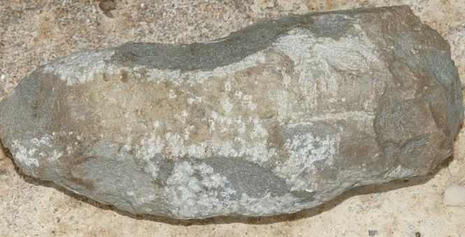 [941] La roche actuelle ;éclats récents plus gris vert , martelage gris clair , le reste de la surface est nature.