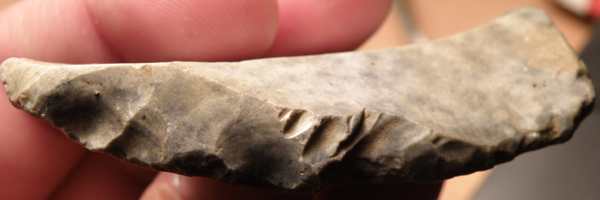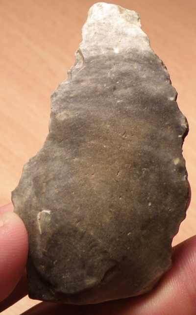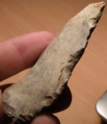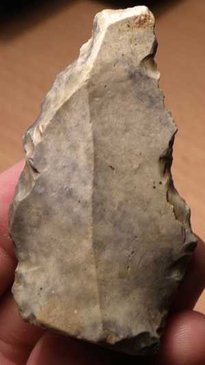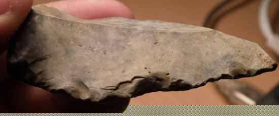 il s'agit d'une sorte de pointe de 7 cm de long 3,8cm de large et pesentant sur l arrĂȘte gauche une retouche importante ,et sur l'arrĂȘte doite une retouche denticulĂ©e alterne