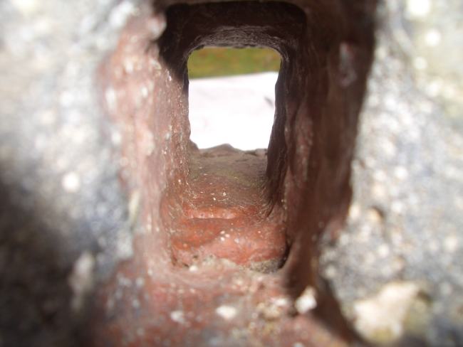 L'idée de HOUAT est plausible, pas facile sur cette photo de voir si c'est vraiment du béton ou une pierre, en R4 on dirait à droite du trou une incrustation de quartz, il faudrait que tu d'assures si c'est du béton ou pas car si ce n'est pas le cas, cela veut dire que les trous ont été percés et là c'est pas le même boulot, les traces rouge clair peuvent être du minium , cette peinture antirouille a été utilisée de l'antiquité jusqu'au 20 em, ce qui m'intrigue en R0 et en R2 qui sont apparemment les faces opposées, c'est le 'nez', il a été reproduit des deux côtés!! Même si tu ne sait jamais ce que c'est ,cela te fera toujours une belle sculpture.