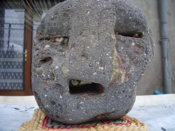 je suis pas un spécialiste en pierres mais ca me parait très dur pour du béton,et oui! il y a toutes sortes de petits quartz incruster dessus.Je mais un gros plans du trous central situer au dessus de la 'tête'