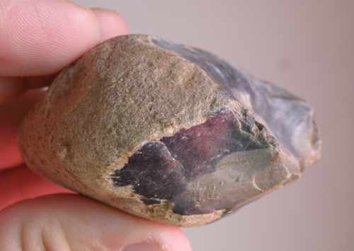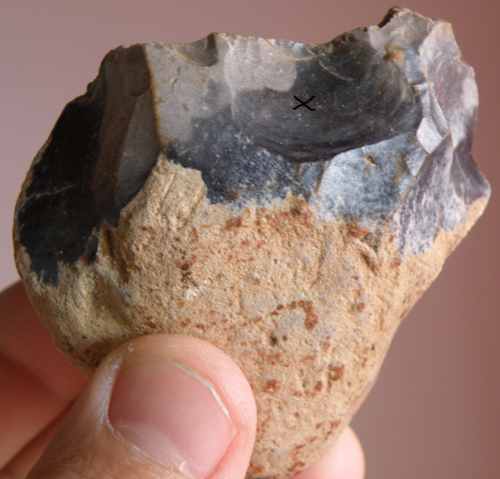 Il se pourrait bien que cela en soit un, en R0 en dessous de 'l'éclat récent' on distingue une petite arrête qui va jusqu'au cortex, on dirait les deux enlèvement initiaux et ce que tu penses être récent du aux machines avec certainement un aspect différent n'est peut-être qu'une sorte de ré-avivage, on y voit des petites retouches en R0 et R4, il possède quand même toutes les caractéristiques d'un chopping, ce n'est que mon humble avis. Cordialement.