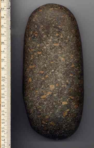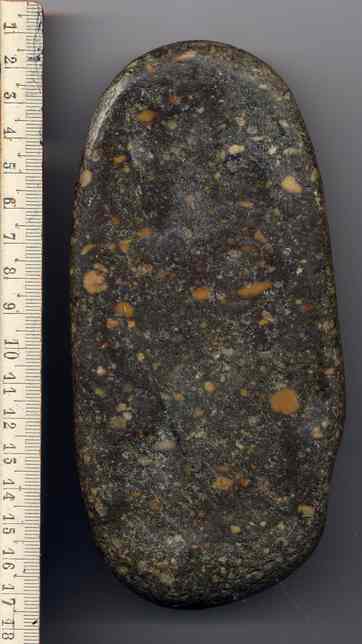 Merci pour ces renseignements et notamment pour tes photos, Bleiz; la roche est très ressemblante en effet. Nous avons aussi pensé à une molette néo, mais ce qui étonne c'est cette surface plane, parfaitement polie, luisante sur les bordsqui semble montrer que c'est cette partie qui était active. A moins que, comme le dit Frèredelacôte, ce soit la partie arrondie ... Si c'est un genre de molette peut-être était-elle utilisée sur une surface plate pour polir ou travailler une matière (du cuir?)