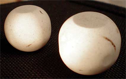 Ces deux objets ont été trouvés dans les champs en Seine-et-Marne, à quelques kilomètres de distance l'un de l'autre. Ils font 16 et 19 mm de diamètre. Ils sont probablement en pierre ou en faience. Ils ont un coté plat bien visible, et à l'opposé un très leger plat. A la circonférence, le plus petit a une légère gorge qui fait tout le tour, tandis que le plus gros à 6 cuvettes réparties régulièrement sur tout le tour.