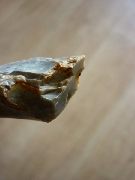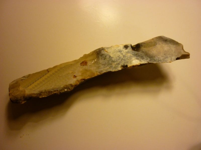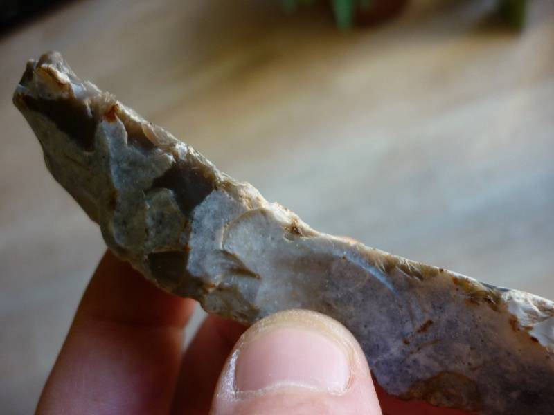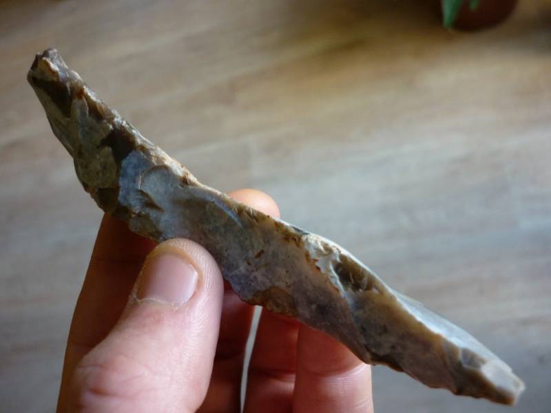 Bon visiblement elle n'a pas servi en tant que grattoir en bout de lame sinon ce serait plus retouché; pourtant on retrouve exaxtement la même forme de bout de lame que la lame de crête de Birac en moins travaillé.