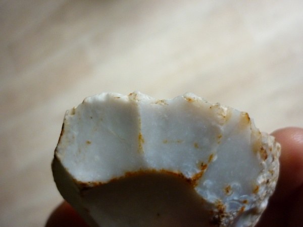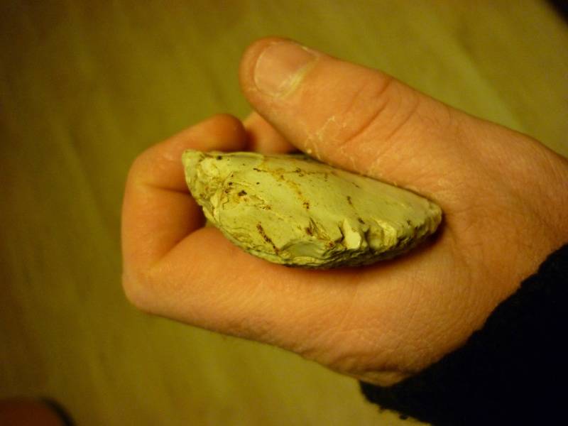 Personnellement je pense qu'il a du servir de grattoir; car lorsqu'on le tient en main (c'est peut être un hasard) on retrouve encore une fois une certaine ergonomie et un certain confort lors de l'utilisation; l'outil se cale tout seul et naturellement (cf photo)
