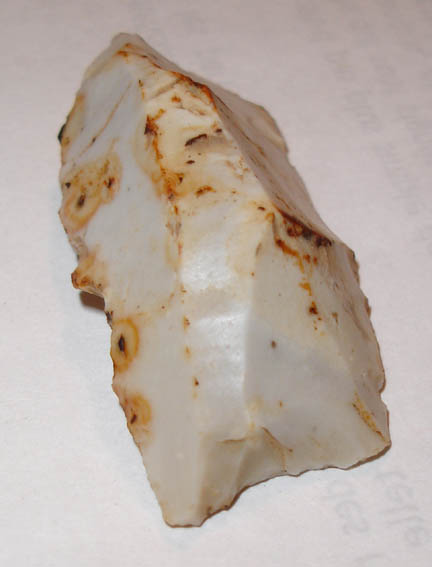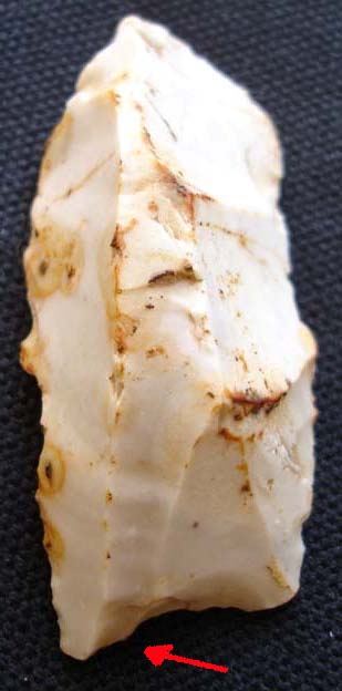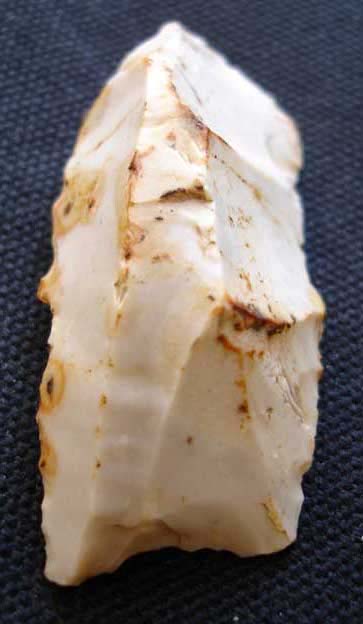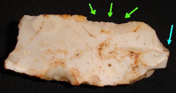 Après quoi, cette lame de crête a été aménagée en racloir à cause des retouches sur le grand côté.