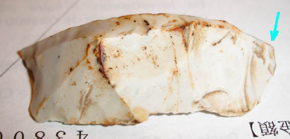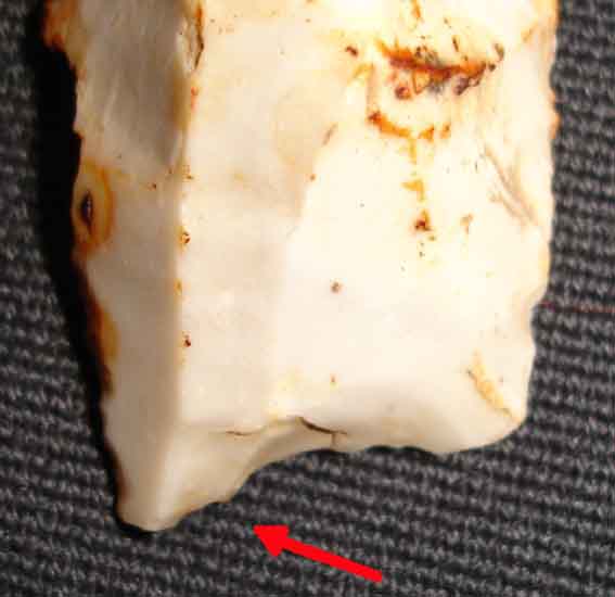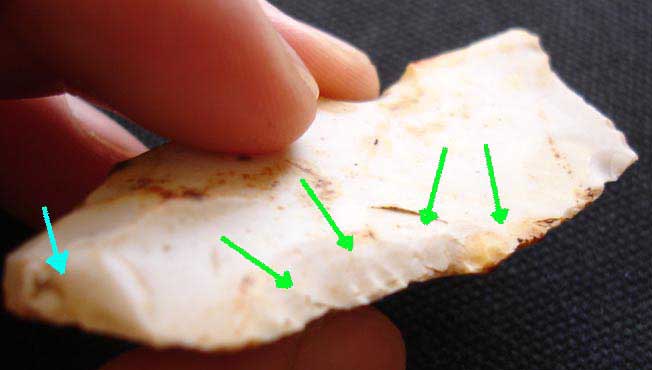 Le dessous est lisse avec juste un plage présentant de fines retouches (flèches vertes sur les photos).