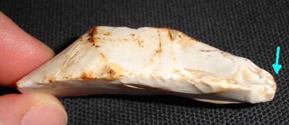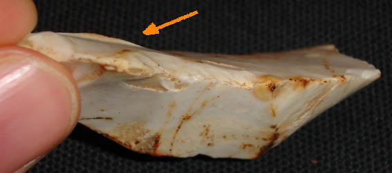 Il y a un bulbe de percussion (flèches oranges) et un talon qui semble avoir fait l'objet d'une préparation (flèches bleues) dont le but m'échappe.