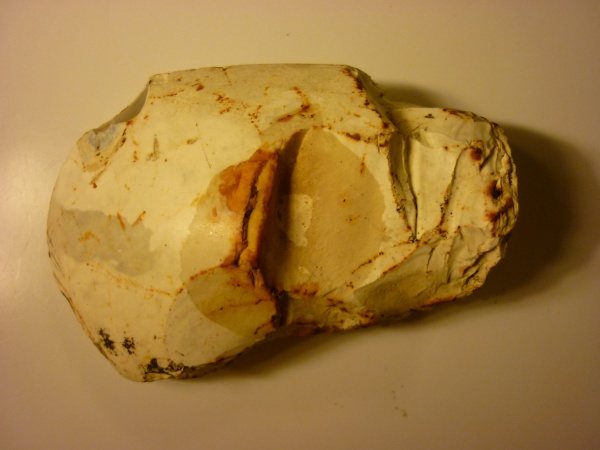 C'est une hache polie ; donc néolithique et je me demande pourquoi a t elle été réaménagée de la sorte car son tranchant est intact hormis quelques chocs modernes. On dirait qu'une partie du talon à été retravaillé pour pouvoir l'emmancher ; a moins qu'elle ai servi de nucléus ?