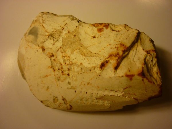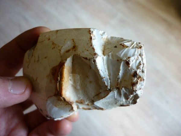 On voit bien la rupture en languette de la hache et l'essai maladroit de réparation plus par bouchardage que par taille