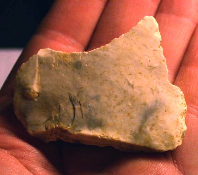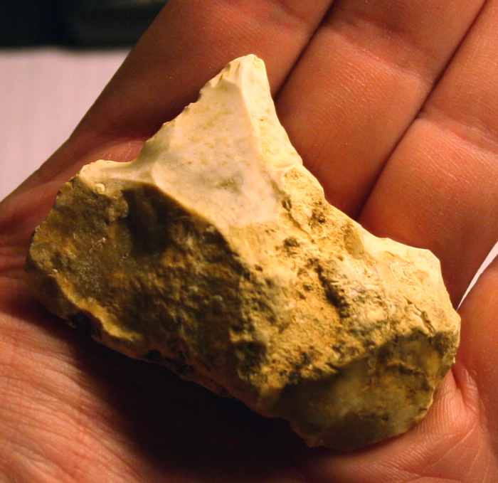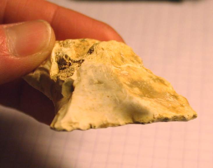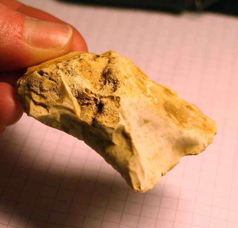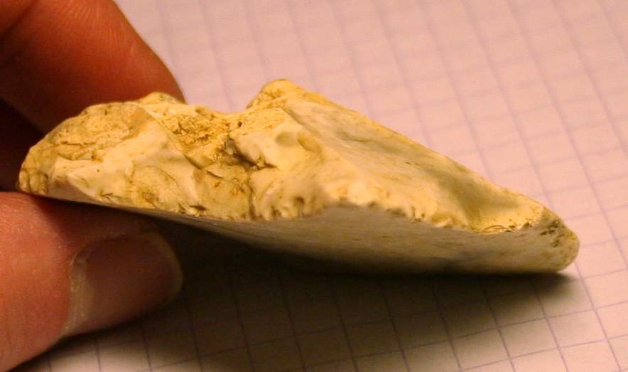 Voici un petit truc pointu (sur éclat) en forme de dent, trouvé en contexte paleo moyen la semaine dernière. (5.5cm de large pour 4cm de long)