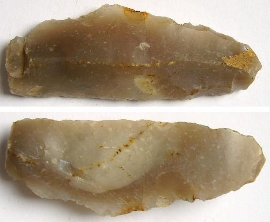 Jolie lame qui semble avoir été retouchée des deux cotés. Elle a peut être pu servir de lame de couteau d'ou l'espèce d'encoche. Tu l'as trouvé dans notre coin ?