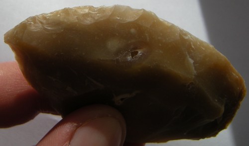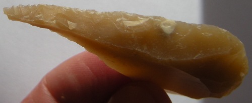 Je mets à la suite deux petits perçoirs et un racloir simple sur éclat. Alors, typologiquement correct tout ça ou pas ? Je suis assez content des retouches parallèles obtenues par pression sur les pointes des perçoirs.
