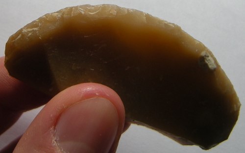 Néodom, j'avoue que j'ai pas trop préparé le nucléus. J'ai débité plusieurs éclats comme j'ai pu et j'ai réussi à en sortir un pas trop mal qui m'a permis de faire le racloir. Les deux tranchants sont retouchés, j'ai mis la photo d'un des deux ci-dessous. Sinon, une fois les éclats produits, c'est très rapide pour façonner un outil. Je me rends compte que les préhistoriques pouvaient tout de même produire très rapidement des outils fonctionnels même si pas toujours fait dans les règles de l'art.