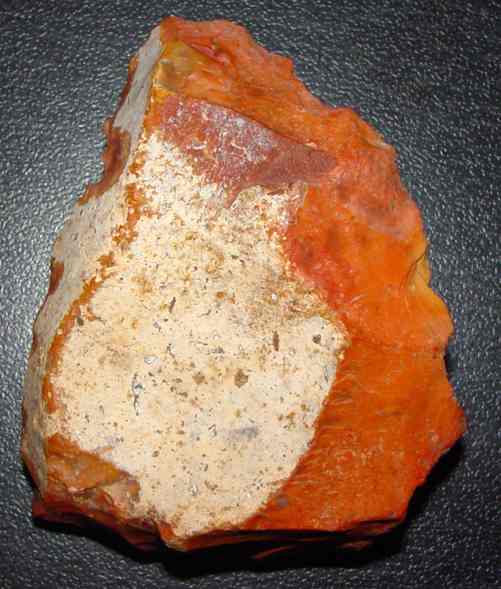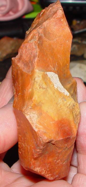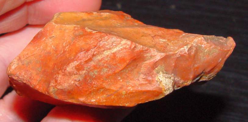 Par rapport à la patine. En fait le silex, n'est quasiment pas patiné (en fait la couleur en surface est la ''presque'' couleur du silex... on peut voire cela par rapport à une esquille récente... ). En fait c'est une bizarrerie du coin. On trouve assez souvent des éclats dans cette matière mais tres rarement des outils.