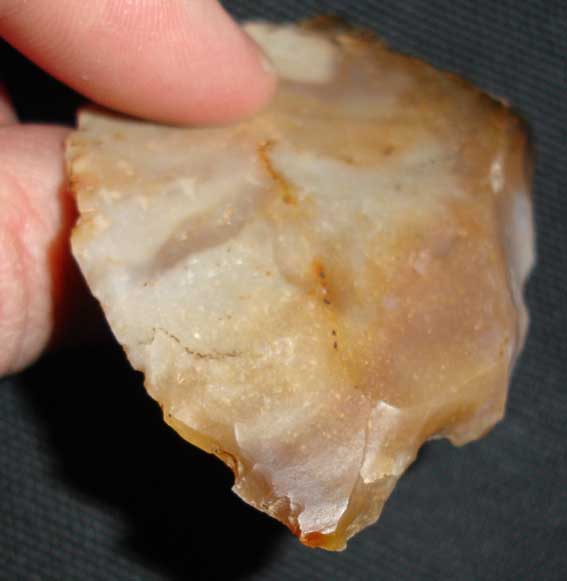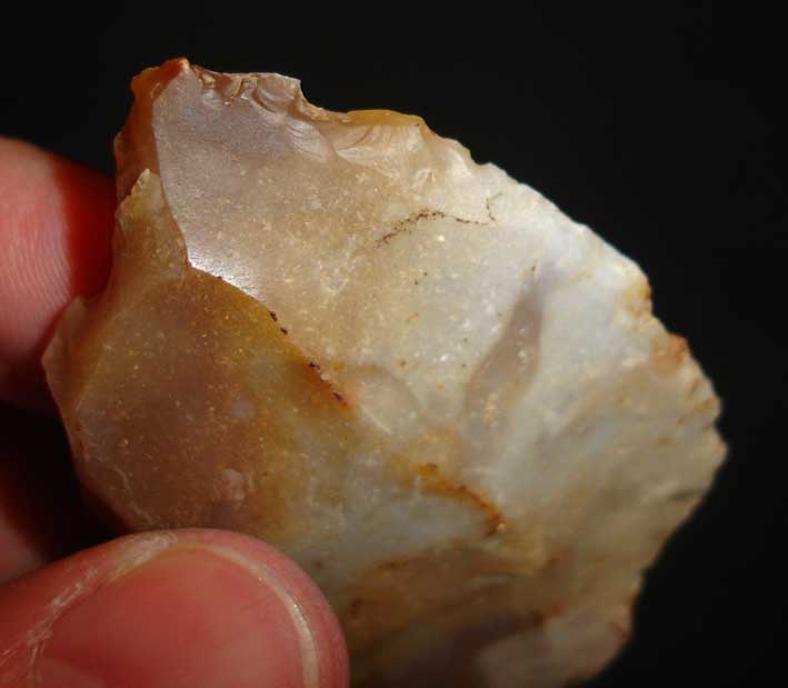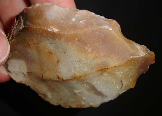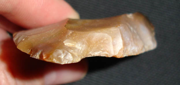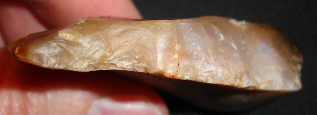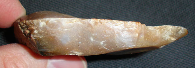 En fait j'hésite entre un couteau a dos abattu (d'où les retouches abruptes a l'oppose du tranchant) ou un grattoir (tjs le coté avec les retouches abruptes... il me semble voire qq traces d'usure de ce coté ) voire les deux...