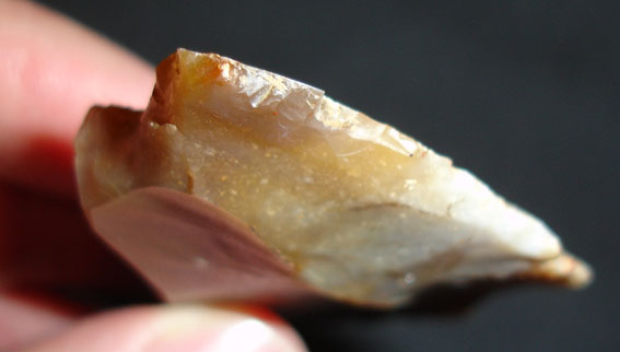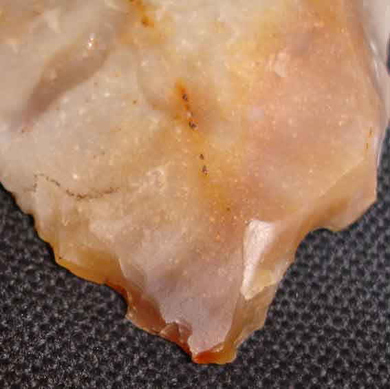 En fait la coche est le résultat de plusieurs retouches et présente également des traces d'usure et des contre-esquilles sur la face (l'autre face est toute plane).