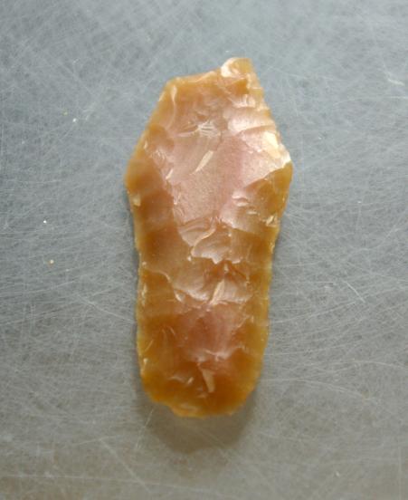 Merci de vous pencher sur cette petite armature... En fait, on ne le voit pas tres bien, j'aurais du le preciser, je ne vois pas de retouche sur la cassure. Je me posais surtout des questions sur la forme a 'tendance pédonculée très légére'... Je me demandais si ce profil particulier était à rapprocher d'une époque ou d'un groupe particulier... Il se peut que la cassure est été endommagé à la taille, car j'ai pu récolter quelques éclats et nucléus sur la parcelle.