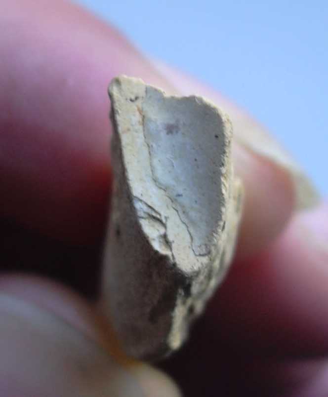 Pour la matière, je ne pense pas à du silex, on en verrait bien un petit bout à quelque-part. Ma première vision du truc a été un fragment de céramique, mais je ne pense pas non plus